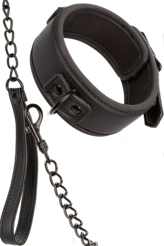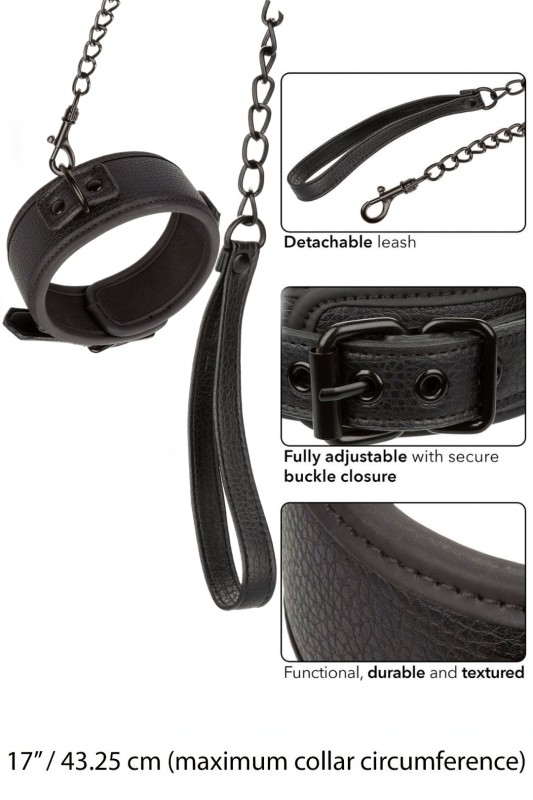 Препуштете се на елеганција и контрола со јаката и поводникот од колекцијата Nocturnal. Овој префинет сет вклучува прилагодлива јака со безбедно затворање со тока и отстранлив поводник за разновидност. Изработен со метален ланец со голема издржливост, додава сензуалност и доминација во играта.