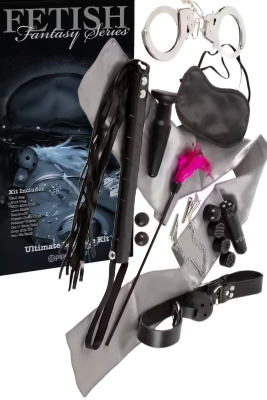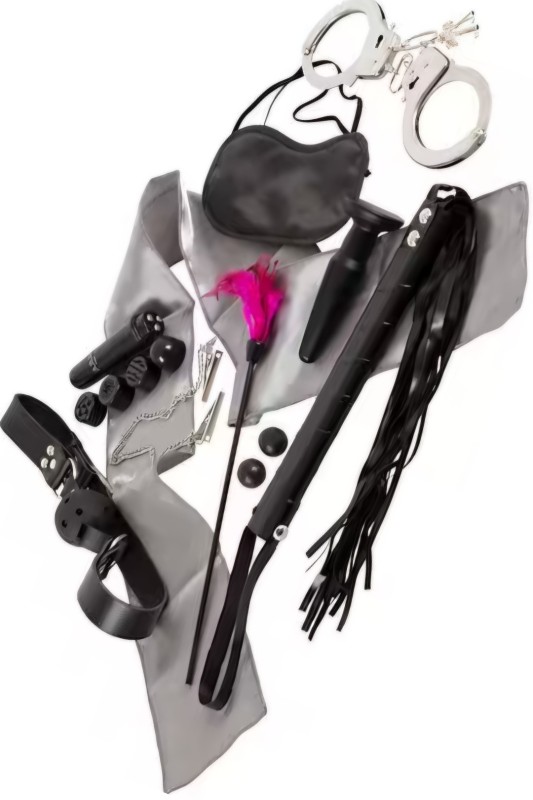Комплет од 10 дела за врзување. Содржи: aнални прнетратори, мини вибратор (со 4 додатоци), превез за очи, лисици, штипки за брадавици, стапче со пердуви, мини камшик, сатенски штипки и љубовни топчиња.