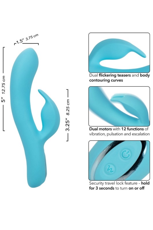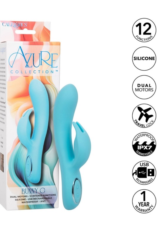 Подгответе се да треперете од возбуда и да се препуштите на врвното искуство со Azure Collection Bunny G, eлегантен додаток за вашите интимни моменти. Се одликува со моќни двојни мотори и тројни трепкачки странични стимулатори, во комбинација со кривини што ги обликуваат контурите на телото и ги погодуваат сите вистински точки. Со 12 функции на вибрации, пулсации и ескалација, овој масажер нуди прилагодливо искуство што се прилагодува на секој ваш каприц.