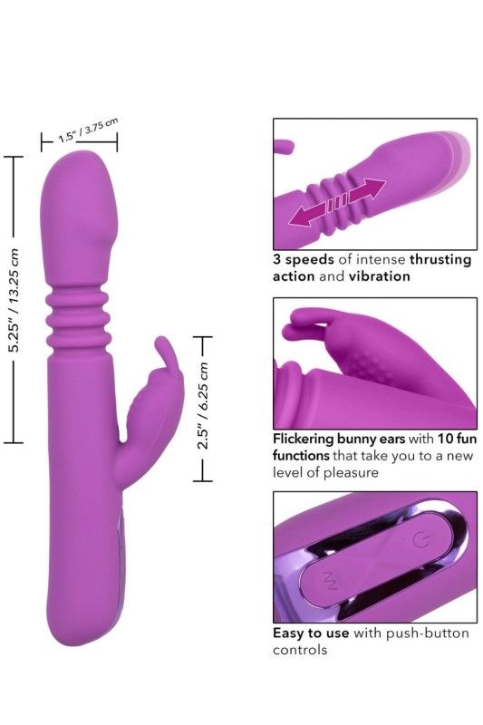 Почувствувајте го возбудувањето на длабокото, ритмичко задоволство со Elite Thrusting Rabbit. Дизајниран со 10 режими на вибрации и 3 моќни брзини на потиснување, овој зајак вибратор испорачува интензивна двојна стимулација за да го разбуди секој нервен крај, а играта може да трае до 2 часа.Додатокот со треперење на зајакот ги таргетира надворешните зони, додека мазната дршка на зајакот се потиснува за внатрешно блаженство.