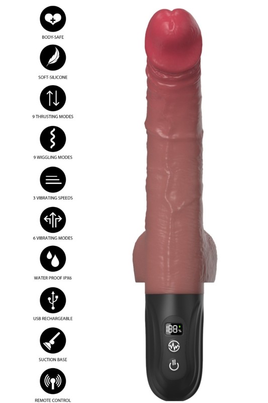 Реалистичниот вибратор со потиснување и мрдање кој е вешто дизајниран за непречено вметнување и интензивна, длабока пенетрација, со отстранлива и прилагодлива основа за вакум, плус далечински управувач!!! Со своето уникатно движење со потиснување, овој вибратор може да се врти од лево кон десно со вртење до 5 сm и да се потиснува нагоре и надолу со речиси 2 сm. Активирајте го неверојатно моќниот мотор, проверете ги сите витални функции на LED екранот и предајте се на неверојатните, татнежни вибрации што ќе ве водат кон експлозивен оргазам.