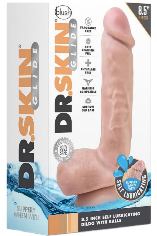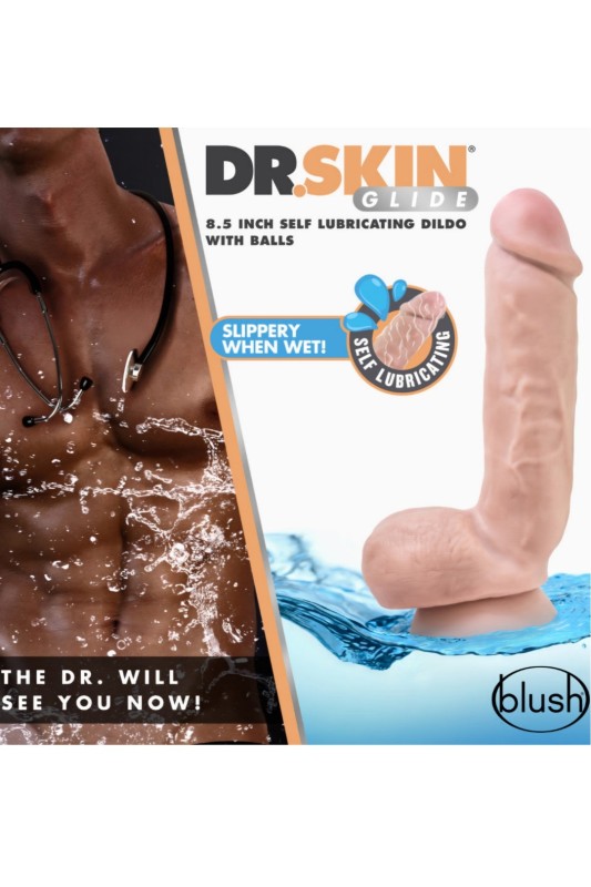 Докторот е тука! Самоподмачкувачкиот супер реалистичен дилдо со тестиси Dr. Skin Glide од 21.5cm е иновативна играчка со самоподмачкување на која ѝ треба само малку вода за да стане лизгава! Dr. Skin Glide има цврста основа за вакуумска чаша што се цврсто сс прилепува на која било рамна површина и е компатибилен со ремен за Страп-Он.