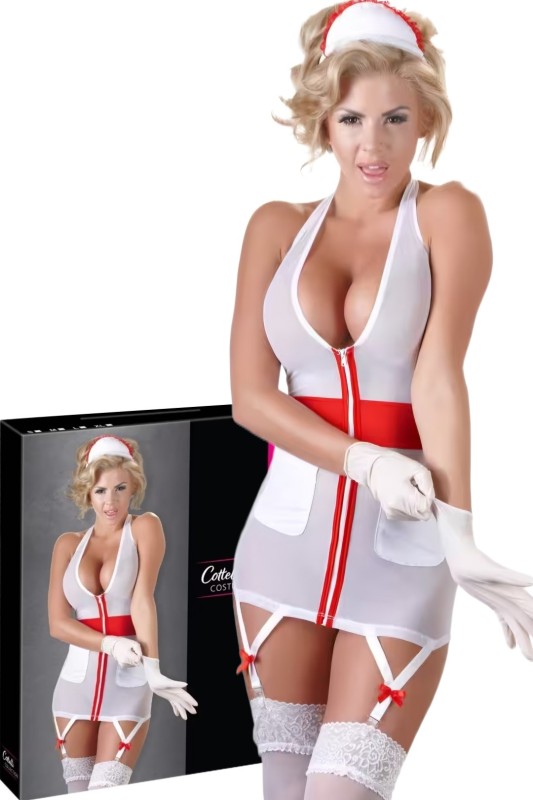 Заводлив фустан направен од бела мрежа со црвени ленти во форма на крст напред. Има патент што оди до крај и го нагласува струкот. Со мали џебови напред каде што можат да се чуваат секакви ситници, а погледот одпозади е неодолив. Малата бела капа за медицинска сестра има црвен набор и додава завршен допир на овој outfit.